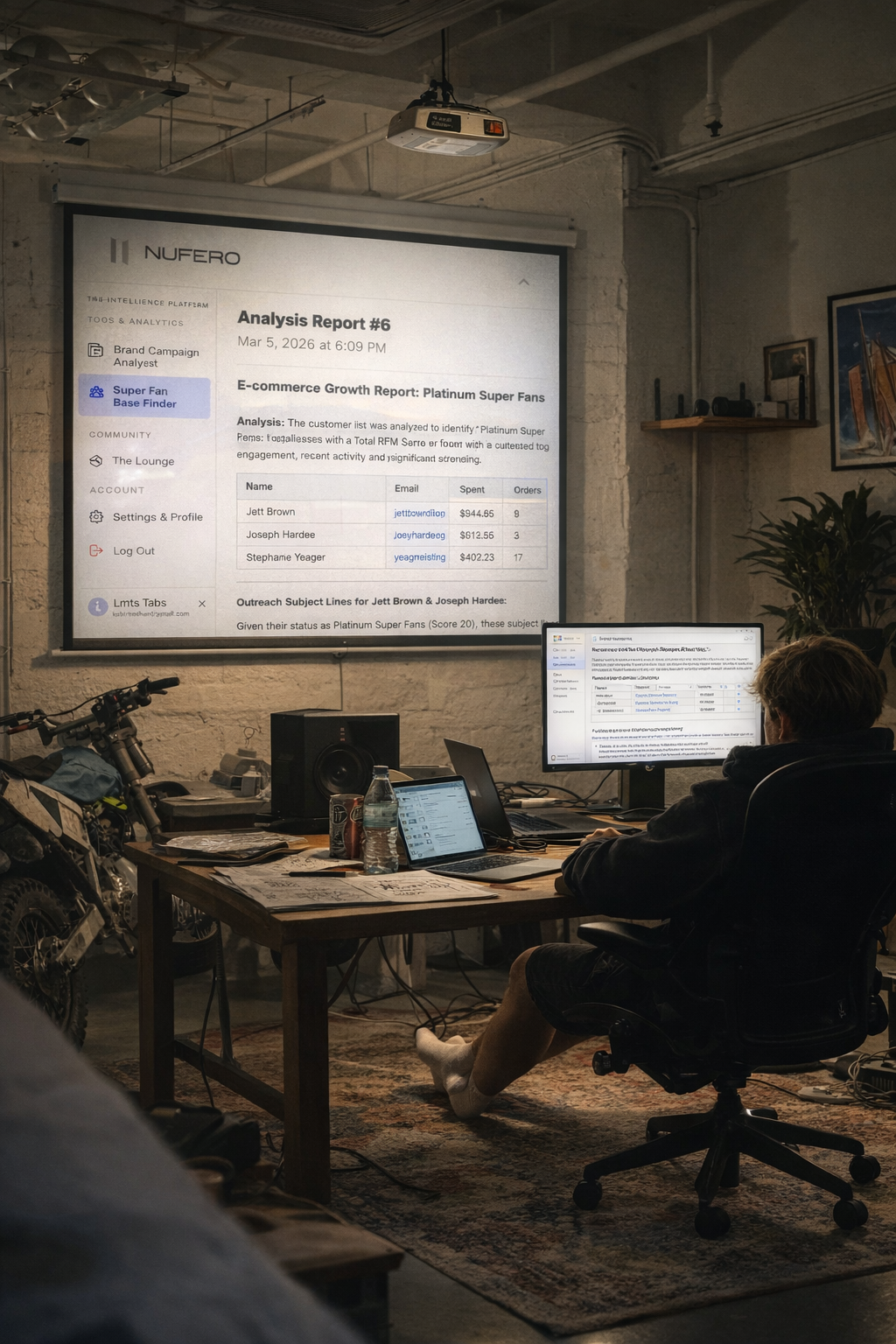 Platinum Super Fans ranked by RFM score. Campaign viability scored 0 to 100. Personalized outreach subject lines included.